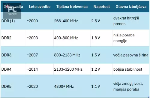 Z vsako generacijo so RAM moduli postajali hitrejši, varčnejši in sposobni prenesti več podatkov.